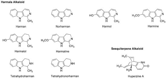 Chinese herb Huperzia serrata (Huperziaceae) contains sesquiterpene alkaloid huperzine A (Figure 7). By whole-cell voltage clamp recording in CA1 pyramidal neurons dissociated from rat hippocampus, Zhang and Hu [113] revealed that huperzine A non-competitively inhibits NMDA-induced currents with an IC50 value of 126 µM in a voltage- and use-independent manner. This alkaloid may be effective for neurodegenerative diseases as a non-competitive antagonist of NMDA receptors.