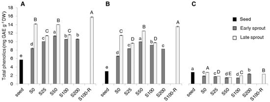 Total (A), free (B) and bound (C) phenolics (mg GAE g−1 DW) in seeds, early and late sprouts of rapeseed sprouted and grown with salt (NaCl) concentration 0, 25, 50, 100, 200 mM (S0, S25, S50, S100, S200, respectively) or sprouted with 100 mM and then grown with distilled water as recovery treatment (S100-R). Average values of duplicate determinations ± standard error are depicted. Different letters within each of the Figure 1A–C indicate statistically significant differences at p = 0.05 (Fisher’s least significant difference, LSD). Lower case letters are for comparison within early sprouts; upper case letters for comparison within late sprouts.