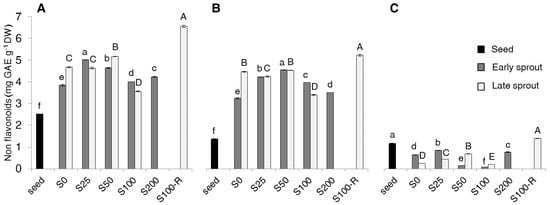 Total (A), free (B) and bound (C) non-flavonoid (NF) content (mg GAE g−1 DW) in seeds, early and late sprouts of rapeseed sprouted and grown with salt (NaCl) concentration 0, 25, 50, 100, 200 mM (S0, S25, S50, S100, S200, respectively) or sprouted with 100 mM and then grown with distilled water as recovery treatment (S100-R). Average values of duplicate determinations ± standard error are depicted. Different letters within each graph indicate statistically significant differences at p = 0.05 (Fisher’s LSD). Lower case letters are for comparison within early sprouts; upper case letters for comparison within late sprouts.