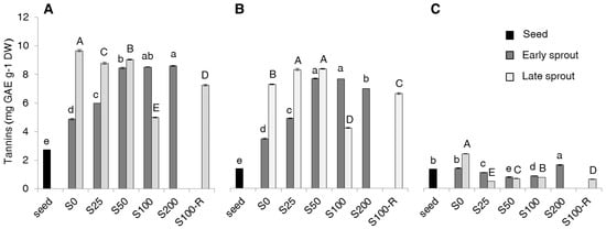 Total (A), free (B) and bound (C) tannin (TAN) content (mg GAE g−1 DW) in seeds, early and late sprouts of rapeseed sprouted and grown with salt (NaCl) concentration 0, 25, 50, 100, 200 mM (S0, S25, S50, S100, S200, respectively) or sprouted with 100 mM and then grown with distilled water as recovery treatment (S100-R). Average values of duplicate determinations ± standard error are depicted. Different letters within each graph indicate statistically significant differences at p = 0.05 (Fisher’s LSD). Lower case letters are for comparison within early sprouts; upper case letters for comparison within late sprouts.
