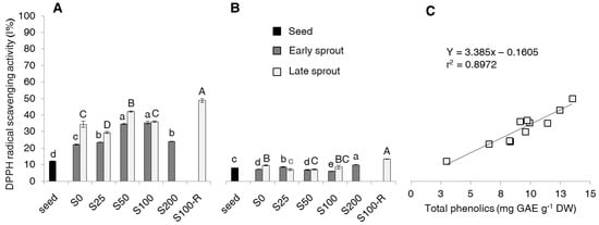2,2-Diphenyl-1-picrylhydrazyl (DPPH) radical scavenging activity (% inhibition of DPPH radical) of (A) free and (B) bound forms of phenolics, and (C) correlation between DPPH radical scavenging activity and content of the free form in seeds, early and late sprouts of rapeseed sprouted and grown with salt (NaCl) concentration 0, 25, 50, 100, 200 mM (S0, S25, S50, S100, S200, respectively) or sprouted with 100 mM and then grown with distilled water as recovery treatment (S100-R). Average values of duplicate determinations ± standard error are depicted. Different letters within each graph indicate statistically significant differences at p = 0.05 (Fisher’s LSD). Lower case letters are for comparison within early sprouts; upper case letters for comparison within late sprouts.