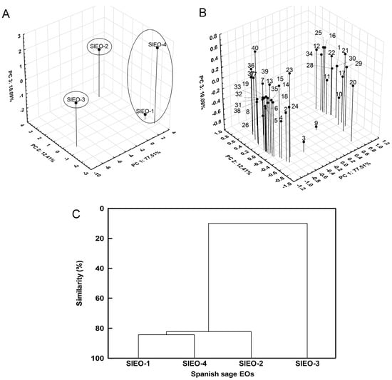 PCA and AHC analyses. (A) 3D-score plot of PC3 vs. PC2 and PC1; (B) 3D-loading plot of PC3 vs. PC2 and PC1; (C) AHC dendrogram: percentages of similarity between studied EOs and clusters.