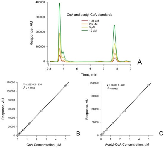 Using the HPLC conditions described in the Materials and Methods section, we were able to accurately quantify CoA and acetyl-CoA in standard solutions. Representative chromatograms for combined CoA and acetyl-CoA standards are shown in Figure 1A. Calibration curves for CoA and acetyl-CoA standards were shown to be linear over the entire concentration range from 0 to 1 mM (data not shown). Only the calibration plots at the physiologically relevant range of 0–5 µM for both CoA and acetyl-CoA are shown (Figure 1B,C, respectively). Values for the peak height for each sample were plotted against known concentrations of individual standards. The equations of the linear regressions for the resulting plots (shown in panels B and C) were used to determine CoA and acetyl-CoA concentrations in the sample.