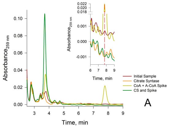 Confirmation of the identity of CoA and acetyl-CoA in the peaks eluting at 3.8 and 7.8 min, respectively, for neutralized deproteinized rat liver extracts. (A) Use of citrate synthase (CS) to confirm that the peak at 3.8 min is due to CoA. Brown trace: initial sample prior to treatment with CS and oxaloacetate; Orange trace: sample treated with CS and oxaloacetate for 5 min at 37 °C; Yellow trace: sample spiked with 10 µM CoA, 10 µM acetyl-CoA and oxaloacetate at zero time; Green trace: sample spiked with 10 µM CoA, 10 µM acetyl-CoA and oxaloacetate after incubation with CS for 5 min at 37 °C. Note that the magnitude of the CoA peak in the initial sample at the magnification shown is relatively small. The insert depicts an expanded scale shown for better resolution; (B) Use of phosphotransacetylase (PTA) to confirm that the peak at 7.8 min is due to acetyl-CoA. Brown trace: initial sample; Orange trace: sample after 5 min treatment at 37 °C with PTA and acetyl phosphate; Yellow trace: sample spiked with 10 µM CoA, 10 µM acetyl-CoA, PTA and acetyl phosphate at zero time; Green trace: spiked sample after incubation with PTA and acetyl phosphate for 5 min at 37 °C.