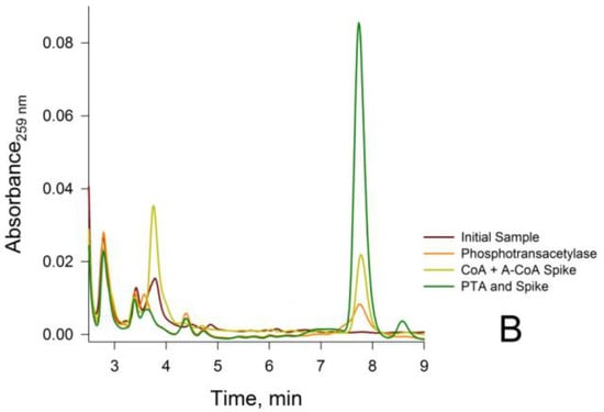 Next, a neutralized rat liver PCA extract was incubated with CS in the presence of oxaloacetate. After incubation of the extract with CS, a complete disappearance of the acetyl-CoA peak was observed together with a concomitant increase in the CoA peak (Figure 2A). In addition, incubation of the neutralized rat liver PCA extract with PTA in the presence of acetyl phosphate resulted in complete disappearance of the CoA peak, and a concomitant increase in the acetyl-CoA peak (Figure 2B). Moreover, incubation of the neutralized rat liver PCA extract (50 µL), spiked with 10 µL of 50 µM CoA or 50 μM acetyl-CoA, with either CS or PTA (and appropriate co-substrates) for 5 min at 37 °C produced similar results (Figure 2A,B). These results confirm that the peak signals in the rat liver extract at 3.8 min and 7.8 min are due solely to CoA and acetyl-CoA, respectively.