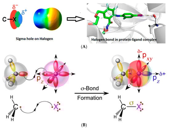 (A) The appearance of a sigma-hole (δ+) that can interact with a region of electron density residing in a different atom. Here, the halogen atom (or R-X) is an “electron-poor” species and acts a halogen-bond donor (D). The acceptor (Y) possesses a rich electron density and acts as a nucleophile, thereby completing the halogen bond between the Donor sigma-hole and the acceptor lone pair. Such an interaction is observed in many drug:receptor systems; (B) Another view detailing the formation of the σ-hole: The covalent bond (C-X) between the Carbon atom and the halogen (σ-bond, yellow) pairs an electron from the carbon with one from the valence pz-orbital of the halogen. The electron withdrawing nature of the R-C moiety results in the depopulation of the pz-orbital of the halogen atom. As a result, it creates an electropositive crown (blue) and flattening of the atomic radius opposite the σ-bond, while the px,y-orbitals remain fully occupied, resulting in an electronegative annulus perpendicular to the covalent bond. (A) has been reproduced with permission from reference [39] and (B) from reference [15].