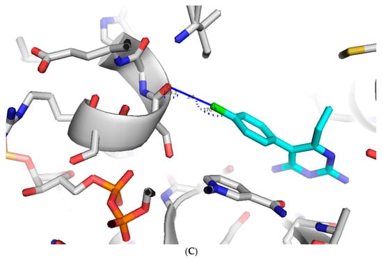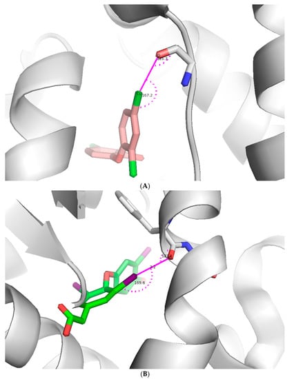 The docking of halogen containing pharmaceutical compounds to their biological targets have been analyzed by a number of groups [26,27,28,29,30,31,32,33,34]. As a starting point, halogen bonding interactions between halogens in drugs and the backbone and side-chain donors of amino acids have been mined from the PDB [38,39]. These studies have primarily relied on strictly restricting “halogen bonds” to the sum of the Van der Waal’s distances between the participating atoms. Among the structures deposited in the PDB, halogen atoms in pharmaceutical compounds were found to interact most frequently with the backbone Lewis bases, viz. O and N, of glycine (Figure 2A).