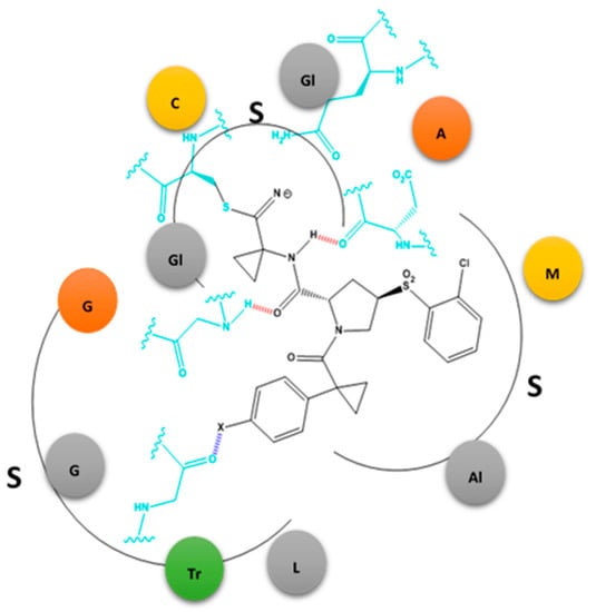 A series of halogen-containing inhibitors of cathepsin have been recently formulated, pursuant to the discovery of hydrogen bonding, between select ligands and the active-site of cathepsin [15]. The fine-tuning of the cathepsin binding inhibitors was possible as a result with an outcome that enhanced several-fold the binding constant observed between the starting ligands and their halogenated successors (Figure 4). For example, XB was found to increase in strength with the mass of the halide substituent (Cl < Br < I). By contrast, no favorable bonding was found to exist with organofluorine derivatized compounds. Furthermore, the halogen bonding interaction was found to have stringent geometrical specifications such as a distance between the interacting atoms below the sum of the van der Waals radii and a strong dependence on the O···X-C angle. Nevertheless, in conclusion, the study revealed that establishing a halogen bond enhanced protein–ligand interactions several-fold which translated into a gain in free enthalpy of −∆∆G = 2.6 kcal/mol.