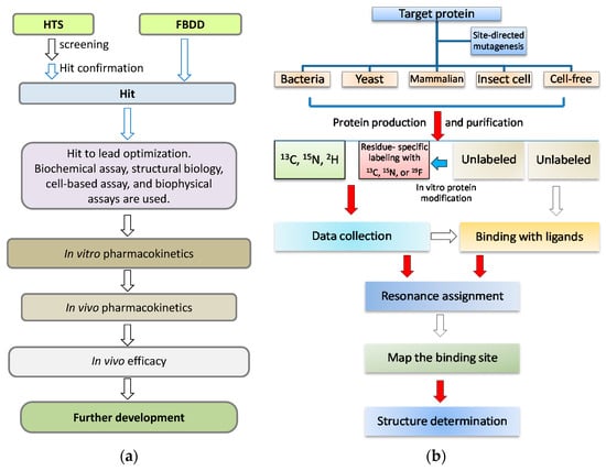 NMR in drug discovery. (a) A simplified flowchart in drug discovery process. When a target is defined, a couple of steps will be gone through in the drug discovery. NMR spectroscopy is useful and plays important roles in the early stage, which is highlighted with blue arrows; (b) A flowchart for the procedures in protein NMR studies. There are several challenging and time-consuming steps from target gene cloning to target-ligand complex structural determination, which include target protein purification, resonance assignment, and structure determination. The challenging steps are highlighted with red arrows.