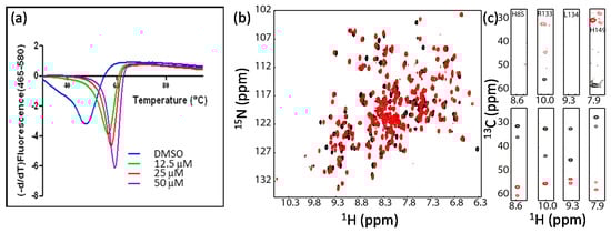An inhibitor can improve protein stability and be helpful for resonance assignment. (a) Inhibitor binding improves protein thermal stability; (b) Inhibitor binding induces chemical shift perturbation; (c) Inhibitor binding improve the signals of Cα and Cβ. Some selected strips of HNCACB spectra of GyrB in the absence (upper panel) or in the presence (lower panel) of the inhibitor were shown. This figure is obtained from the reference [] with permission.