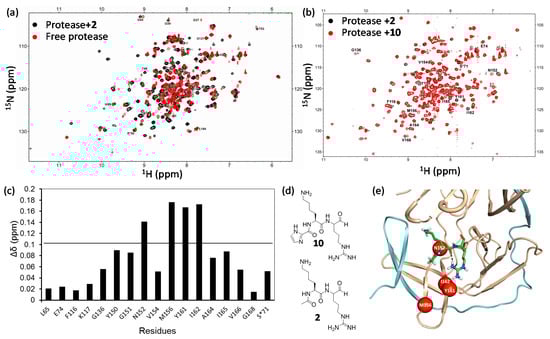 West Nile virus protease and inhibitor interactions. (a) Superimposed 1H-15N-HSQC spectra of protease in the absence (red) and presence (black) of compound 2; (b) Superimposed 1H-15N-HSQC spectra of protease in the presence of compound 2 (black) and compound 10 (red); (c) Chemical shift difference of protease in the presence of 2 and 10; (d) Structures of compound 2 and compound 10; (e) Structural model of West Nile virus protease in complex with 2. The inhibitor is shown in sticks. The residues exhibit obvious different chemical shifts are shown in red spheres. NS2B and NS3 poly-peptides are shown in cyan and orange, respectively. This figure is obtained from the reference [] with slight modifications.