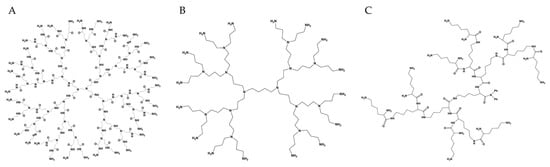 Schematic representation of third generation dendrimers. (A) PAMAM with ethylenediamine core; (B) PPI with 1,4-diaminobutane core; (C) PLL with Boc-l-Lys(Boc)-OH benzhydrylamide core. Illustrations generated by ChemDraw Professional Version 16.0.1.4.