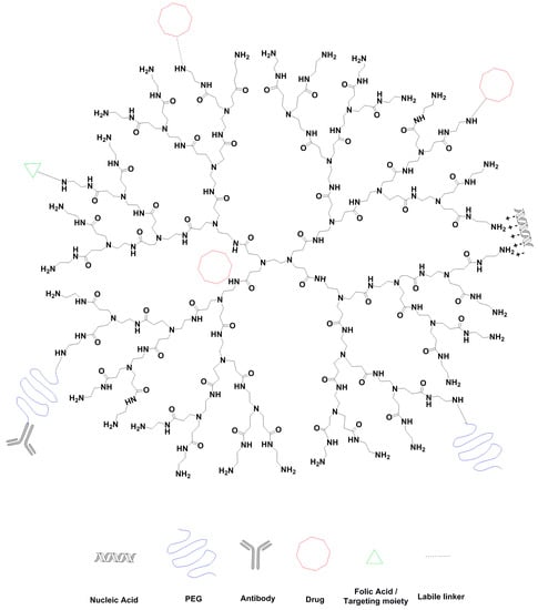 Dendrimers are highly branched polymeric macromolecules with well-defined and uniform sizes and shapes. Their basic structure comprises three main components: a central core, repetitive branching units, and terminal groups, that provide modifiable surface functionalities. The increase in the number of repeated branching units determines the generation of the dendrimer and is responsible for the formation of a globular structure [1,2,3]. The high level of control possible over their architecture makes them attractive as systems for drug [4,5] and gene [6,7,8] delivery applications. Drugs and oligonucleotides can be either encapsulated in their internal cavities or bound to their surfaces through hydrophobic or electrostatic interactions. They can also be covalently attached through reactions with the terminal functional groups.