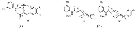 The most selective σ2R ligands were (+)-1R,5R-(E)-8-benzylidene-5-(3-hydroxyphenyl)-2-methyl-morphan-7-one (CB-64D, σ2Ki = 16.5 nM, σ1/σ2Ki = 185) and (+)-1R,5R-(E)-8-(3,4-dichlorobenzylidene)-5-(3-hydroxyphenyl)-2-methylmorphan-7-one (CB-184, σ2Ki = 13.4 nM, σ1/σ2Ki = 555). These benzomorphans displayed affinity for the μ opioid and σ2 receptors, because the aforementioned receptors share the same enantioselectivity. The (+)-isomers are selective for the σ2R, while the (−)-isomers have a higher binding affinity for the σ1R. This chemical category of derivatives is merged with granatane- or tropane-related bicyclo-analogs. The 9-N atom of the granatane ring can accommodate bulky substitutions without a significant loss of σ2R affinity and selectivity. A N-substitution with an additional nitrogen atom that is four or more carbon atoms apart enhances σ2R binding affinity. A N-aromatic substitution can also be accommodated, but is not crucial for σ2R affinity or selectivity [83,84,85].