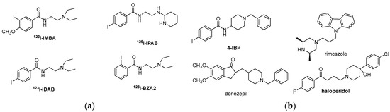 (a) Radiolabeled σ2R ligands for in vitro binding studies. 11C-Labeled and 18F-labeled conformational flexible benzamide analogs; (b) σ2R ligands for in vivo binding studies.
