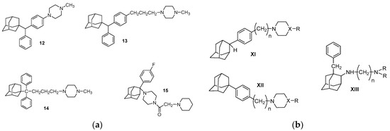 1-Methyl-4-{3-[4-[α-(1-adamantyl)phenyl]phenyl]propyl}piperazine (13) presented an acceptable toxicological profile associated with an interesting antiangiogenic activity against tumors and was particularly prominent in (BxPC-3) pancreas, (DU-145 and PC3) prostate, (OVCAR-5) ovarian and (HL-60) leukemia xenografts on SCID mice [136]. 1-Methyl-4-{4-[α-(1-adamantyl) phenylmethyl]phenyl}piperazine (12) (σ1Ki = 3.2 nM, σ2Ki = 32 nM, σ1/σ2Ki = 11.8) was prominent in pancreas [137]. 4-[4,4-Diphenyl-4-(1-adamantyl)butyl]-1-methylpiperazine (14) (σ1Ki = 15 nM, σ2Ki = 60 nM, σ1/σ2Ki = 4) displays selective action against ovarian cancer on mice (IGROV-1) and presented as potent as cisplatin [138]. The above adamantane adducts were also tested with a prototypical study (formaline test) of their effect in putative neuropathic pain induced by anticancer drug Paclitaxel [28,29,30] and proved to be putative analgesic agents. 1-[2-(4-Fluorophenyl)-2-adamantyl]-4-(1-piperidineacetyl)piperazine (15) had also notable antitumor activity [139] (Figure 11).