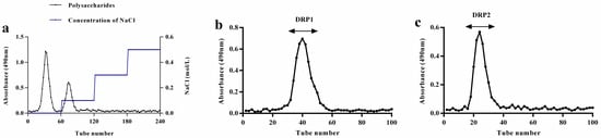 The crude dandelion root polysaccharide (DRP) was obtained by hot-water extraction, ethanol precipitation, and deproteinization. To purify the polysaccharide, the crude DRP was separated on a DEAE-52 cellulose column eluting with distilled water and stepwise addition of different NaCl solutions (0.1, 0.3 and 0.5 mol/L). Two polysaccharides were separated and designated as DRP1 and DRP2. DRP1 and DRP2 accounted for 70.4% and 22.8% of the total DRP content, respectively. The overall recovery was 93.2%, which revealed that the polysaccharides had been effectively eluted from the column. The DEAE-52 cellulose column chromatogram of DRP is shown in Figure 1a. Then the DRP1 and DRP2 were further purified through a SephacrylTM S-200 gel filtration column. Each polysaccharide produces only a single symmetrically sharp peak (Figure 1b,c), suggesting that their purity is very high. The DRP1 and DRP2 fractions were collected for the subsequent analysis.