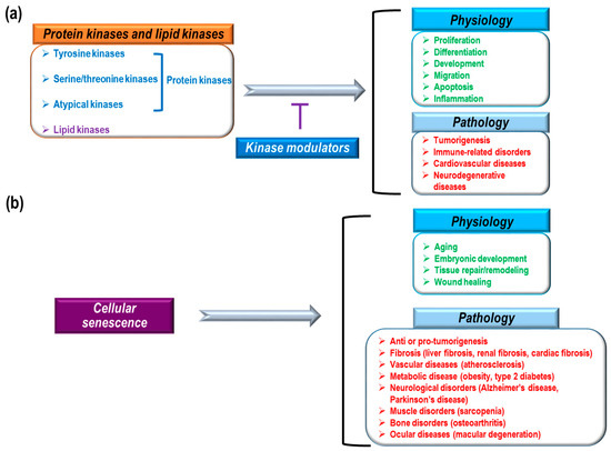 Physiological and pathological roles of protein and lipid kinases and cellular senescence. (a) 518 kinases (protein kinases (blue): tyrosine kinases, serine/threonine kinases, and atypical kinases; lipid kinases (purple)); and (b) cellular senescence has a variety of physiological (green) and pathological (red) functions.