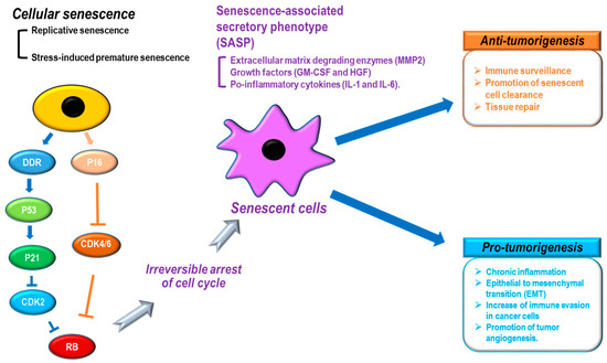When cellular senescence is induced, cells show distinct characteristics, such as morphological changes (cell and nuclear size enlargement, cell flattening, vacuolization, and stress granules), protein alternations (overexpression of senescence-associated β-galactosidase [SA-β-gal] and P16), chromatin remodeling (senescence-associated heterochromatin foci [SAHF] formation and lamin B1 loss),and the senescence-associated secretory phenotype (SASP: secretion of extracellular matrix degrading enzymes [MMP2], growth factors [GM-CSF and HGF], and pro-inflammatory cytokines [IL-1 and IL-6]) (Figure 2) [31,34]. In particular, the SASP shows a variety of cellular effects on neighboring cells [31]. For tumor development, the SASP is known to function as both a tumor promoter and suppressor [31,75,76,77]. The SASP can negatively contribute to tumorigenesis by increasing immune surveillance, promoting senescent cell clearance, and repairing tissues (Figure 2). In contrast, the SASP can also potentiate cancer development through tissue dysfunction via chronic inflammation, epithelial to mesenchymal transition (EMT), increasing immune evasion in cancer cells, and promoting tumor angiogenesis (Figure 2). In addition, although senescence is implicated in removing damaged cells and tissue to protect against cancer development, senescence has also been identified as a key contributor to aging [78,79] and aging-related diseases [80]. Thus, the question arises whether the role of senescence is to mediate tumor suppression or tumor development? Acute/transient senescence to eliminate damaged cells can give rise to beneficial effects such as tumor suppression, whereas chronic/long-term senescence can result in the accumulation of senescent cells with detrimental effects such as tumor promotion [31,33]. During aging, an increase in the number of senescent cells can be accompanied by dysfunction of the SASP, the DNA repair system, and immune function [31]. The eventual integration of these multiple senescence processes can cause premalignant cells to develop into cancerous cells.