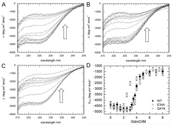 (A–C) CD spectra (A; WT; B; E34A, C; Q41N) and (D) molar ellipticity, θ222 of WT (closed circles) and mutant (E34A; open triangles and Q41N; open circles) ubiquitin as a function of guanidine hydrochloride concentration. CD spectral changes by increasing a concentration of GdmCl are indicated by arrows (⇧). Molar ellipticity was calculated from CD absorption at 222 nm (see Materials and Methods). Error-bars show root mean square deviation from the average.