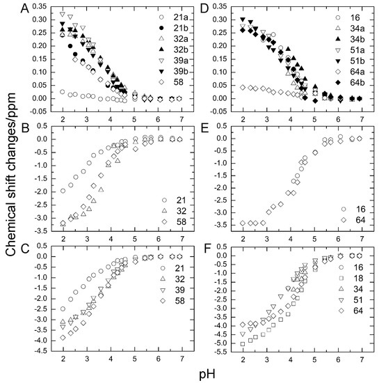Changes in aspartate (A–C) and glutamate (D–F) chemical shifts of WT ubiquitin by pH titration from pH 6.88 to pH 1.98 at 298 K. (A) Hβ of aspartate; (B) Cβ of aspartate; (C) C′ of aspartate, (D) Hβ of glutamate; (E) Cγ of glutamate; (F) C′ of glutamate.