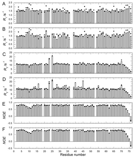 15N-spin relaxation dynamics of ubiquitin mutants (E34A and Q41N) (histograms) at 278 K. (A) 15N-longitudinal relaxation rates, R1 for E34A; (B) 15N-longitudinal relaxation rates, R1 for Q41N; (C) 15N-transverse relaxation rates, R2 for E34A; (D) 15N-transverse relaxation rates, R2 for Q41N; (E) Heteronuclear Overhauser effects, 15N-NOE for E34A; (F) Heteronuclear Overhauser effects; 15N-NOE for Q41N. Data for WT protein are represented by closed circles in each panel. Data for WT and Q41N were obtained from the literature [22] for comparison (Reproduced with permission from American Chemical Society).