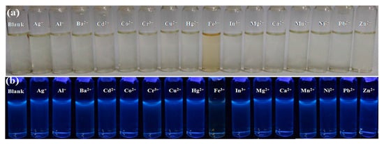 Iron is an important element present in the earth’s crust and plays an important role in biochemical process [,]. For example, the balance of Fe3+ ion has significant effects on human health and various physiological functions [,,]. Fe3+ ion acts as a cofactor in various enzymatic reactions in biological systems []. Iron deficiency causes low oxygen delivery to cells, low blood pressure, and immune deficiency, whereas its excess causes damage of lipids, nucleic acids, and proteins [,,,,]. Alzheimer’s, Huntington’s, and Parkinson’s diseases are induced due to cellular toxicity caused by iron ions [,,].