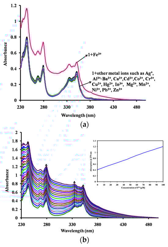 The UV-vis absorption properties of receptor 1 were investigated in an ACN/H2O solution. Receptor 1 absorbance spectrum showed peaks at 240 nm, 270 nm, 280 nm, 337 nm, and 353 nm (Figure 2). Upon the addition of various metal ions such as Ag+, Al3+, Ba2+, Ca2+, Cd2+, Co2+, Cr3+, Cu2+, Hg2+, In3+, Mg2+, Mn2+, Ni2+, Pb2+, and Zn2+ in their perchlorate form to the receptor 1 solution showed negligible effect on the peaks intensity and position (Figure 2), whereas the addition of Fe3+ metal ions exhibited a hyperchromic shift in the spectrum of receptor 1. Furthermore, we performed the systematic titration of Fe3+ with receptor 1, as shown in Figure 2b; the increasing ratio of Fe3+ to receptor 1 resulted in a linear increase in the intensity of absorption peaks at 240 nm, 270 nm, 280 nm, 337 nm, and 353 nm. This titration also showed a hyperchromic shift in peak position, which was not observed for other metal ions.