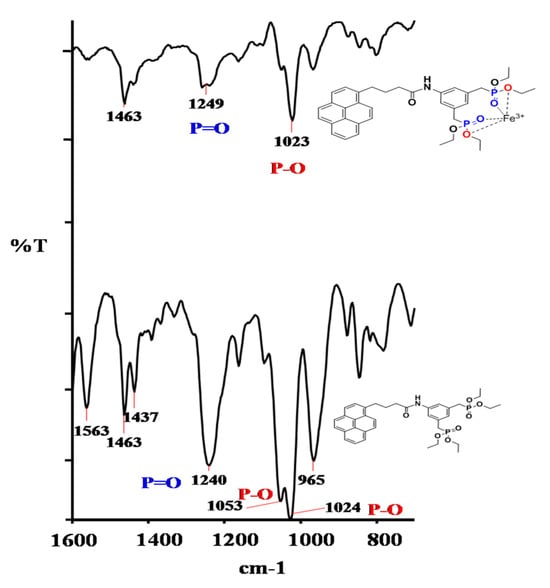 The employed colorimetric, UV-vis absorption, and fluorescence emission spectroscopic techniques confirmed that receptor 1 exhibits selectivity towards Fe3+ ions. To confirm the nature of the complex formation between receptor 1 and Fe3+ ions, the Fourier transform infrared (FT-IR) spectrum of receptor 1 was recorded in the absence and presence of Fe3+ ions (Figure 6). The IR spectrum of receptor 1 shows P=O bond stretching vibration at 1240 cm−1 and P-O-C (alkyl) bond vibrations at 1053 cm−1 and 1024 cm−1 of the phosphonate ester groups of the receptor []. After the complexation between receptor 1 and Fe3+ ions, the band at 1240 cm−1 shifted to 1249 cm−1 with decreasing intensity. The intensity of bands at 1053 cm−1 and 1024 cm−1 were also notably decreased after complexation. Based on the IR study, we can hypothesize that the two phosphonate ester groups of receptor 1 coordinate with Fe3+ ions in the complex formation.