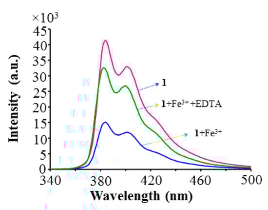 For practical applications, reversibility is an important aspect in the chemical receptor. Receptor 1 is sensitive towards the detection of Fe3+ ions. It is well known that ethylenediaminetetraacetic acid (EDTA) binds to Fe3+. We have used EDTA to examine the reversibility of the 1–Fe3+ complex. The gradual addition of EDTA to the 1–Fe3+ complex resulted in a significant increase in the fluorescence emission peak intensity at 384 nm and 420 nm (Figure 7). These experiments confirm a return of the maximum emission peak intensity to its original state. Thus, fluorescence emission spectroscopy experiments support the reversibility of receptor 1 towards Fe3+ ions.