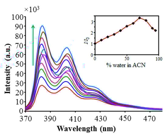 The selectivity of the probe towards cations was incredibly affected due to AIEE properties [,]. Therefore, we examined the emission response of 1 in the direction of AIEE. As shown in Figure 8, the emission experiments were recorded for 1 upon the incremental addition of water fraction from 0% to 95% in ACN. The increase in fluorescence emission peaks at 384 nm and 420 nm (λex = 280 nm) with respect to fw (0–80%) was observed. The emission intensity starts to rise at fw > 10% and continues to increase until fw 80%, at which point the solvating influence of the mixture is worsened to such an extent that the molecules start to aggregate. These results clearly indicate that the probe 1 showed AIEE properties in fw = 80% upon aggregation. Furthermore, we examined the quantum yield (Φf) of probe 1. The initial quantum yield of 1 in a dissolved state in acetonitrile i.e., at 0% fw (Φf = 1.9), which was increased by ~6-fold to the maximum value at 80% fw (Φf = 11.7). In colorimetric response, a strong blue emission was observed under UV light at 365 nm (Figure S6). This result strongly supports the AIEE of probe 1 in H2O (0–80%). The further addition of water (fw > 80%) led to the downfall of the emission, which is due to the precipitate formation; the photoluminescence (PL) intensity decreases to some extent as both water and acetonitrile are hydrophilic solvents and only the smaller aggregates in the suspension contributed to the emission, as indicated by the data shown in the inset of Figure 8. However, there was not much influence observed on the emission efficiency; at fw 80% and 90%, Φ is about 11.7% and 7.9%, respectively (see ESI Table S1) []. Such emission behavior is referred to as the AIEE effect, thus, compound 1 is AIE active. This was also confirmed by dynamic light scattering, showing that ~90% of the water content’s average hydrodynamic diameter increased to 175 nm (ESI Figure S7).