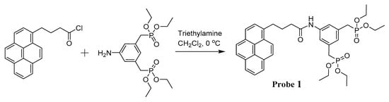 Pyrene is a well-known organic florescent compound with environment-responsive vibrational fluorescence structures, a singlet long excited lifetime, and the ability to form excimers. Here, we used pyrene chromophore to design receptor 1. Taking into account its properties, we conjugated pyrene chromophores with bisphosphonate phenyl rings. Receptor 1 was synthesized in a one-step amide bond formation between pyrene butyric acid chloride and phosphonate-appended aniline, as shown in Scheme 1. The obtained product was fully characterized using 1H-NMR, 13C-NMR, FT-IR, high-resolution mass spectrometry (HRMS), and electrospray ionisation mass spectrometry (ESI-MS).