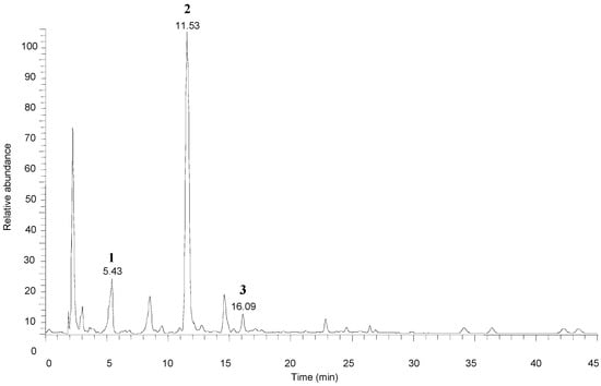 Total ion chromatogram of amygdalins characterized in bitter almonds by HPLC-ESI-MS/MS. (1) amygdalin amide; (2) amygdalin; (3) neoamygdalin.