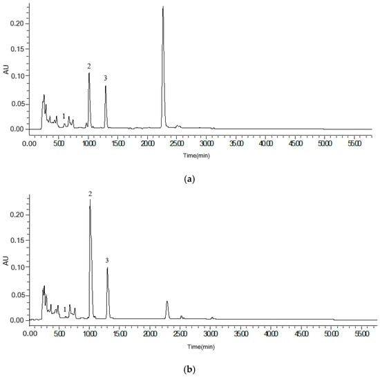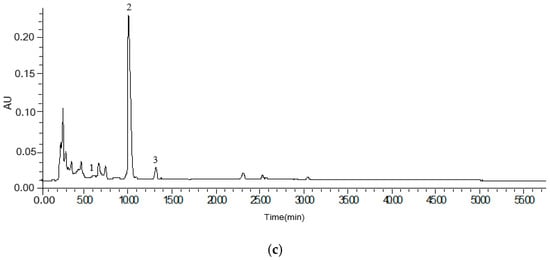 HPLC-UV chromatograms of raw bitter almond (a), scalded bitter almond (b) and stir-fried bitter almond (c). (1) amygdalin amide; (2) amygdalin; (3) neoamygdalin.