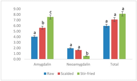 The relative contents of different forms of amygdalin of various processed bitter almonds were used to evaluate the changes in almonds after processing (Figure 3). More concretely, the contents of amygdalin in processed products were significantly higher than in the raw almonds (p < 0.01). Amygdalin values were found to be notably higher in stir-fried varieties than in scalded samples (p < 0.05). The lowest neoamygdalin relative concentration was found in stir-fried varieties. However, there was no significant difference among the three processed products in the relative contents of total amygdalin (p > 0.05). The peak area of amygdalin amide was decreased after heating, which means the amygdalin amide may dehydrated and changed to amygdalin. The results indicated that the composition of amygdalin in almonds is largely influenced by processing method. It proved that heating inhibited the enzyme that decomposes amygdalin, and at the same time it made neoamygdalin and amygdalin amide change into amygdalin.