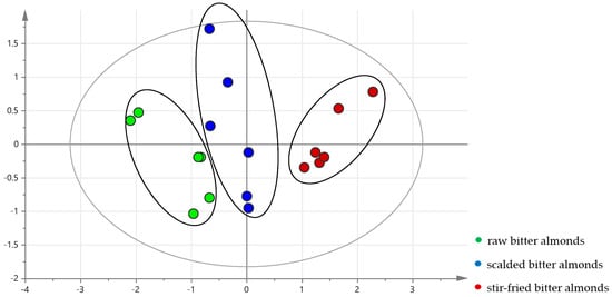 There was no change in the composition of the three kinds of processed products. However, the concentration ratios of amygdalin, neoamygdalin were different after processing. Amygdalin content and the relative content of neoamygdalin were used as variables for PCA. The HPLC data were processed by unsupervised PCA []. After Pareto (Par) Scaling with mean-centering, the data were displayed as score plots (Figure 4). It is evident from Figure 4 that most raw, scalded and stir-fried bitter almonds were clearly clustered into three groups, indicating there were differences among three processed samples. Raw bitter almonds were farther from stir-fried bitter almonds, while scalded bitter almonds were between the other two processed products. The result showed that the transformation between amygdalin and neoamygdalin were carried out step by step in raw, scalded and stir-fried bitter almonds.