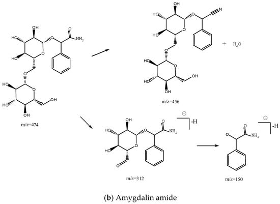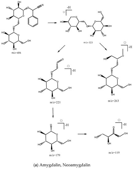 Amygdalin, neoamygdalin and amygdalin amide were observed to have the same fragmentation pathways and fragment ions in the raw, scalded and stir-fried samples. It is indicated that amygdalin, neoamygdalin, amygdalin amide might exist naturally in bitter almonds.