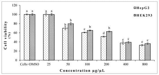 Viability percentage of HepG2 and HEK293 after treatment of crude oregano Essential Oils (EO). Bars with different letters for each cell line indicate mean values significantly different at p < 0.05 according to Tukey (B) test. Data are expressed as mean of three replicates ± SD.