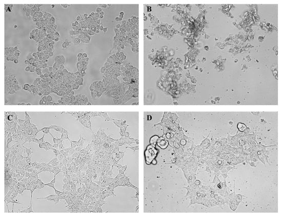 The effect of oregano EO treatment (24 h) on HepG2 and HEK293 cell morphology were evaluated using inverted phase contrast microscopy. Both types of cells were treated using the IC50 value calculated in the case of hepatocarcinoma cells (236 µg/µL). Control cells (treated only with dimethyl sulfoxide (DMSO)) show the normal morphology (Figure 2A,C), whereas, HepG2 cells showed remarkable morphological changes, such as detaching in the degradation phase (Figure 2B). HEK293 cells were less affected and demonstrated lower morphological changes (Figure 2D).