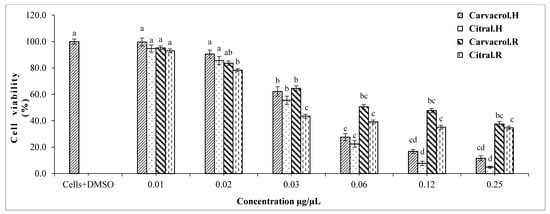 Viability percentage of HepG2 and HEK293 cells after treatment with different concentrations of citral and carvacrol. Bars with different letters for each single substance indicate mean values significantly different at p < 0.05 according to Tukey (B) test. Data are expressed as mean of three replicates ± SD. Where: carvacrol.H: liver cells treated with carvacrol; citral.H: liver cells treated with citral; carvacrol.R: renal cells treated with carvacrol; citral.R: renal cells treated with citral.