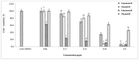 Viability percentage of HepG2 and HEK293 cells after treatment of thymol and limonene. Bars with different letters for each single substance indicate mean values significantly different at p < 0.05 according to Tukey (B) test. Data are expressed as mean of three replicates ± SD. Where: carvacrol.H: liver cells treated with carvacrol; citral.H: liver cells treated with citral; carvacrol.R: renal cells treated with carvacrol; citral.R: renal cells treated with citral.
