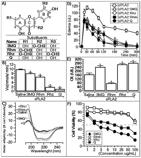 Structures of the quercetins assayed with the enzymatic, circular dichroism, edema, creatine kinase levels, and cytotoxic assays. (A) The structures of all flavonols assayed here and R1, R2, and R3 indicated the principal substituents found in all of the flavonols; (B) The effect of the previous treatment of the sPLA2 samples on the enzymatic activity after 30 min compared with native sPLA2. 3MQ, Rhm, Rhz, and Q. Each column represents the mean and SD of six replicates (n = 6), and the asterisk (*) means p < 0.05; (C) CD spectra of isolated sPLA2 (saline) and all quercetins incubated with the enzyme. Data over the range of 190–280 nm are shown and are expressed in theta machine units in molar ellipticity (θ cm²/dmols), and each spectrum represents the analysis of three CD runs; (D) Graphic of the edema performed after 30 min of administration of the four quercetins evaluated (10 μg protein and 12.5 μg compound). The results are expressed as the mean ± standard deviation (n = 5), and the * means p < 0.05. We used the ANOVA and Bonferroni a posteriori tests; (E) Myotoxic activity of native and pretreated sPLA2 via measurement of the creatine kinase assay. Each column is shown as the mean and SD of n = 5 for each sample including saline, and ANOVA was used as the statistic assay with Dunnett as the a posteriori test. The * shows groups with significant differences with sPLA2 (p < 0.05); (F) To evaluate the cytotoxic potential of all compounds, MTT (3-(4, 5-dimethylthiazolyl-2)-2,5-diphenyltetrazolium bromide) assay was performed with the J774 macrophages. Cells were incubated previously with each compound, and each point in the cell viability graph represents the mean and SD of 12 experiments.