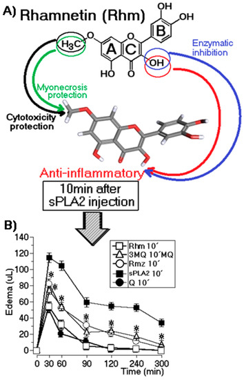 Structure-function relation between molecular regions of Rhm and its activities. (A) Molecular structure of Rhm in which the 3-OH in the C ring should lead to enzymatic and pharmacological inhibition and OCH3 in the A ring should lead to cytotoxic and myotoxic protection; (B) Flavonol injection after 10 min of sPLA2 application (10 μg protein and 12.5 μg compound). The results are expressed as the mean ± standard deviation (n = 5), and the * means p < 0.05 using the ANOVA and Bonferroni a posteriori tests.