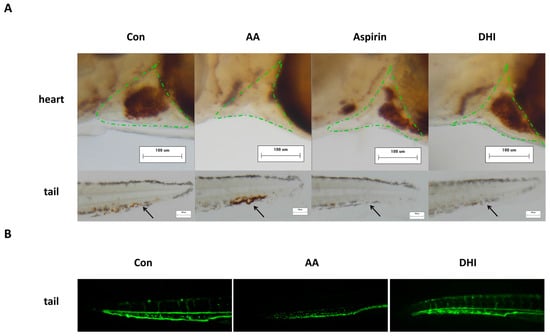 The zebrafish thrombosis model was established by exposing the zebrafish to 40 μM arachidonic acid (AA) for one hour. The representative images of zebrafish stained by o-dianisidine were captured by a stereomicroscope. As shown in Figure 1A, compared with the control, it is clear that visible red blood cells (RBCs) almost disappeared in the heart of AA-treated zebrafish (marked by the green dashed line), whilst the accumulation of RBCs in the vessel at the tail part of zebrafish (as marked by the black arrow) was increased after AA treatment. However, treatment of aspirin at 22.5 μg/mL could obviously recover the quantity of heart RBCs, which is in accordance with previous reports [27]. Figure 1A also showed that DHI could significantly inhibit the tail venous thrombus and recover the quantity of heart RBCs in the zebrafish thrombosis model for the first time, which suggested that DHI can exert an anti-thrombotic effect in vivo. The effect of DHI against AA-induced thrombosis was further validated in the transgenic LCR-GFP (locals control region-green fluorescence protein) zebrafish [28] whose hemoglobin was GFP-labeled. As shown in Figure 1B, the AA-treated zebrafish exhibited dark and discontinuous blood flow compared to the continuous and bright flow of the control, which could be recovered by DHI.