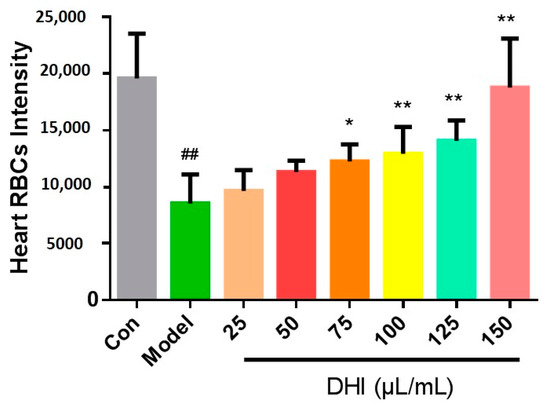 Heart red blood cells intensity in the zebrafish of control group, model group (AA 40 μM), and DHI group of different concentrations (25–150 μL/mL). The error bars represent the standard deviation based on ten repeated samples. All data was represented by the mean ± SD, ## p < 0.01, ** p < 0.01, * p < 0.05, n = 10.