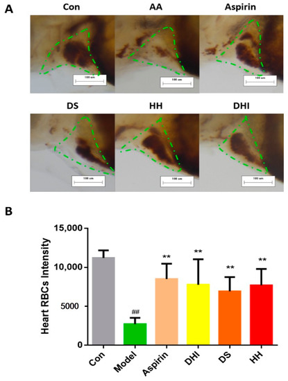 Heart red blood cells (green dashed line) stained with o-dianisidine (A) and the heart red blood cell intensity in the zebrafish of the control group, model group (AA 40 μM), positive drug group (aspirin 22.5 μg/mL), danshen (DS) group (100 μL/mL), honghua (HH) group (100 μL/mL), and danhong group (100 μL/mL), at a 100× magnification; (B) The error bars represent the standard deviation based on ten repeated samples. All data was represented by the mean ± SD, ## p < 0.01, ** p < 0.01, n = 10.