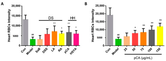 Heart red blood cells intensity in the zebrafish of the control group, model group (AA 40 μM), and compounds of DHI groups (100 μg/mL) (A) and the p-coumaric acid levels of different concentration groups; (B) The error bars represent standard deviation based on ten repeated samples. All data was represented by the mean ± SD, ## p < 0.01, ** p < 0.01, * p < 0.05 (n = 10). SaB, DSS, LA, RA, pCA and HSYA stand for salvianolic acid B, danshensu, lithospermic acid, rosmarinic acid, p-coumaric acid and hydroxysafflor yellow A, respectively.