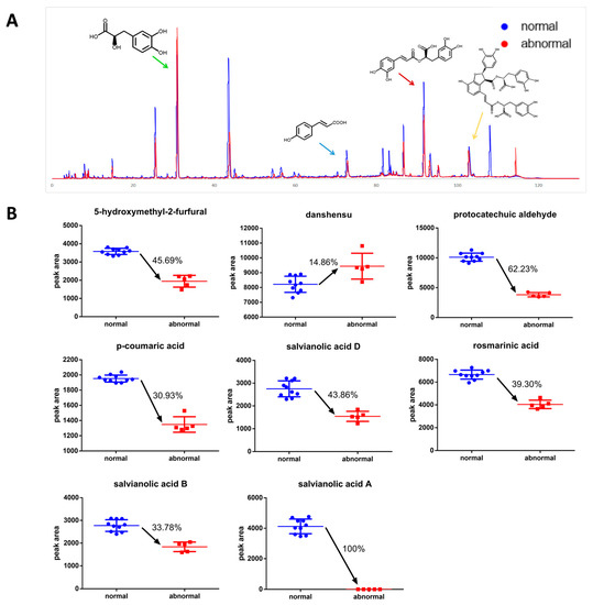 The distinction of the HPLC chromatogram (A) and compound content (B) between normal and abnormal DHIs.