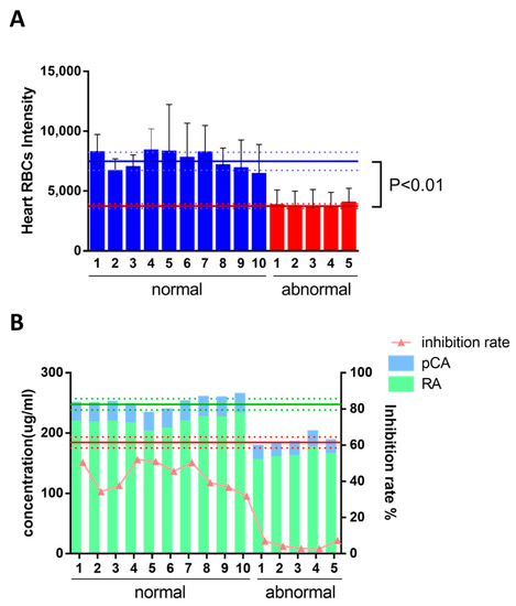 Heart red blood cell intensity in the zebrafish of normal and abnormal DHI (A) The distinction of the total concentration of RA and pCA in accordance with the inhibition rate between the normal and abnormal DHI; (B) The error bars represent the standard deviation based on ten repeated samples. Data in Figure 6A was represented by the mean ± SD and data in Figure 6B was represented by the mean, n = 10.