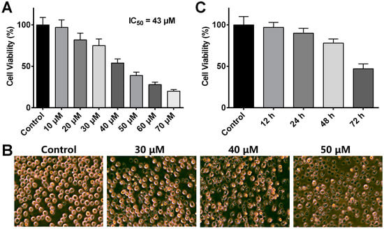 (A) Cell viability of MV4-11 cells treated with different concentrations of ADR; (B) Microscopic images of the cell culture treated with different concentrations of ADR; (C) Cell viability of MV4-11 cells treated with 43 μM ADR for different time span.